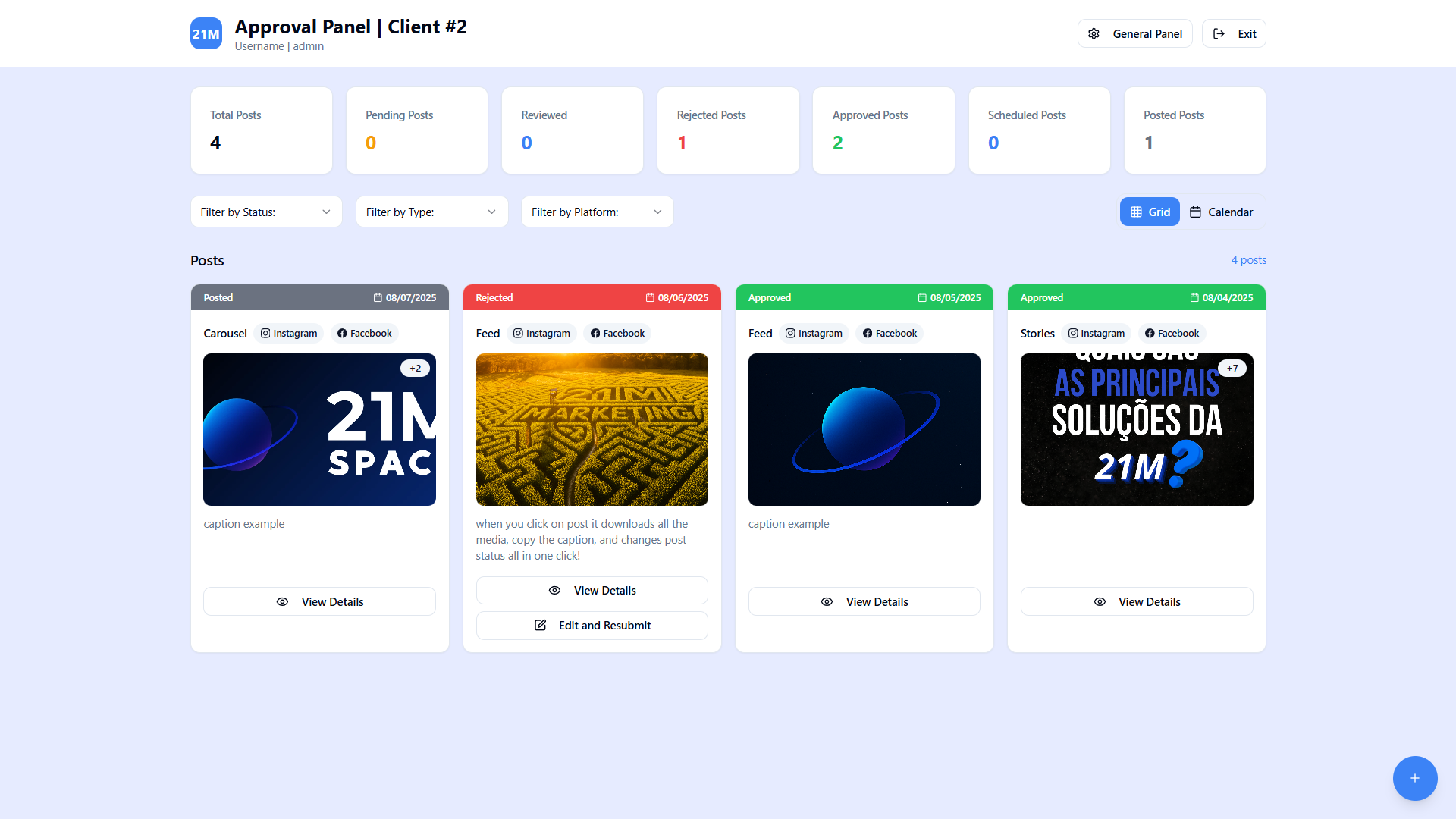 21M Space is a platform to organize, approve, and manage social media posts — made for agencies, marketing teams and freelancers who deal with client workflows. Create workspaces for each project or client. Upload posts, get feedback, track approval status, and keep your content calendar on track.