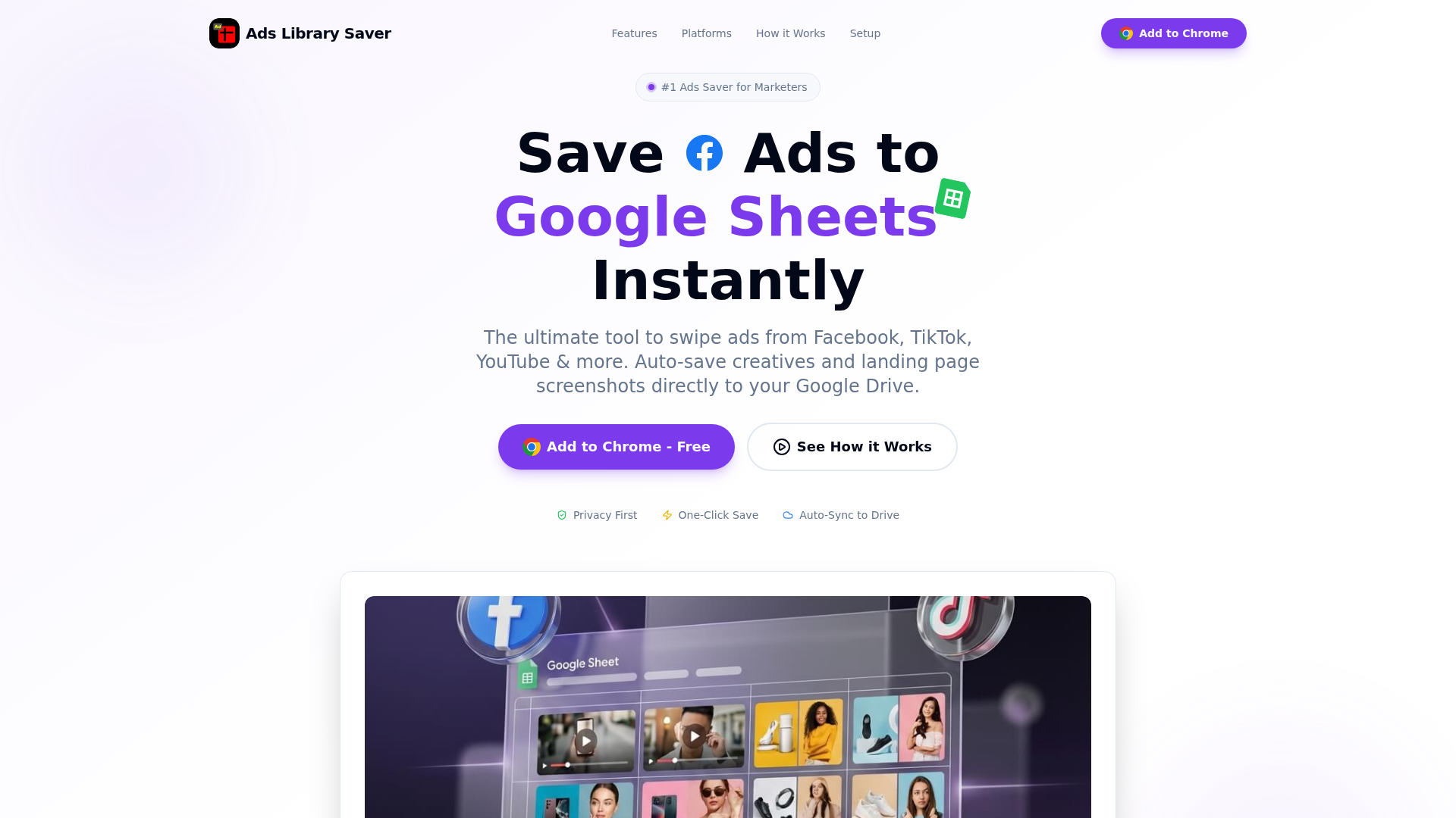 Operating as a Chrome browser extension, Ads Library Saver integrates directly with Google Sheets for structured data and Google Drive for media file storage. This approach ensures user data privacy and control within the Google ecosystem.