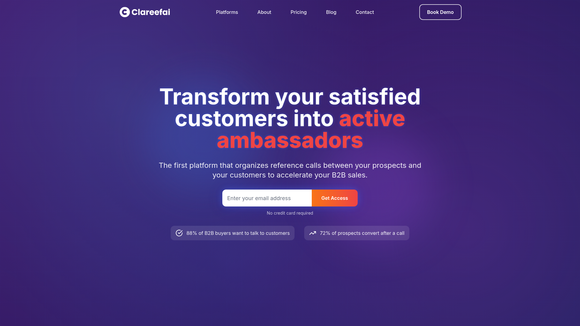 Clareefai offers a groundbreaking solution for B2B companies to harness the power of genuine customer advocacy. By facilitating direct, verifiable connections and authentic testimonials, it builds profound trust, accelerates sales, and transforms your customer base into your most effective sales force. Explore Clareefai to revolutionize your sales and marketing strategy.