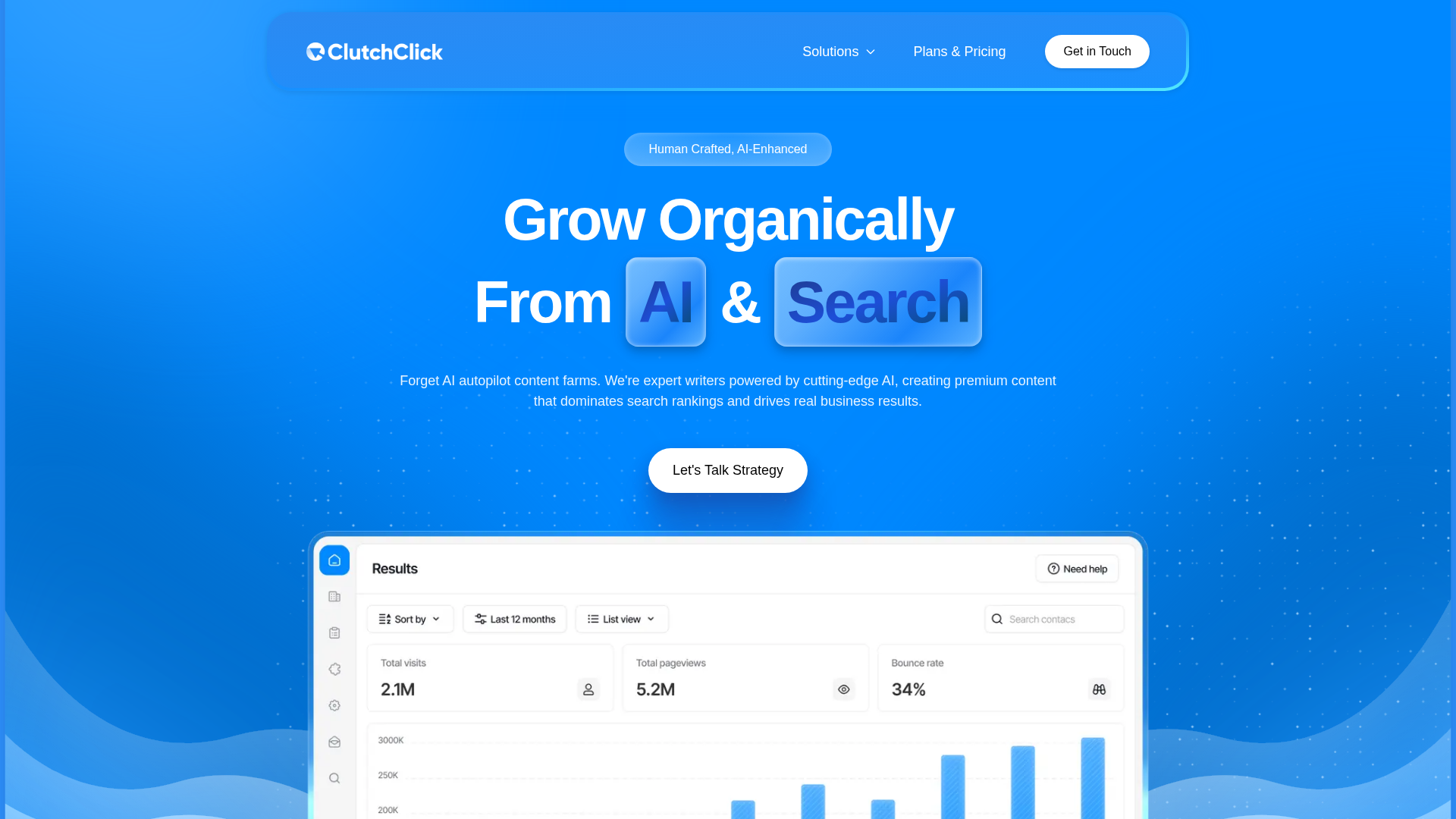 ClutchClick is an innovative SaaS platform offering human-crafted, AI-enhanced SEO and content marketing solutions. Its primary goal is to drive significant organic growth, dominate search rankings, and deliver real business results by merging expert writing with cutting-edge AI.