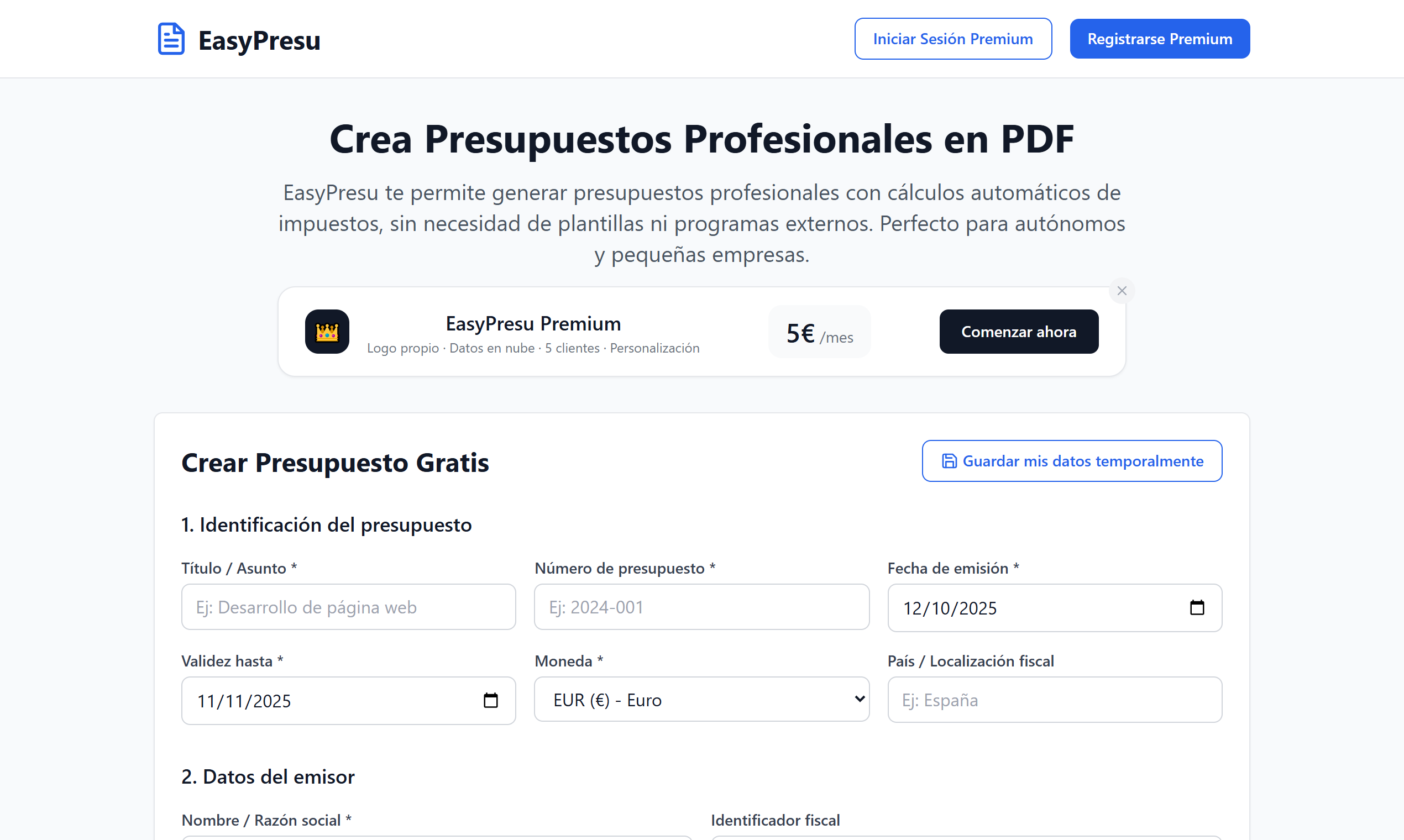 EasyPresu es una plataforma web para crear presupuestos profesionales en PDF de forma rápida y sencilla. Dirigida a autónomos, freelancers y pequeñas empresas que necesitan generar presupuestos de calidad sin complicaciones.