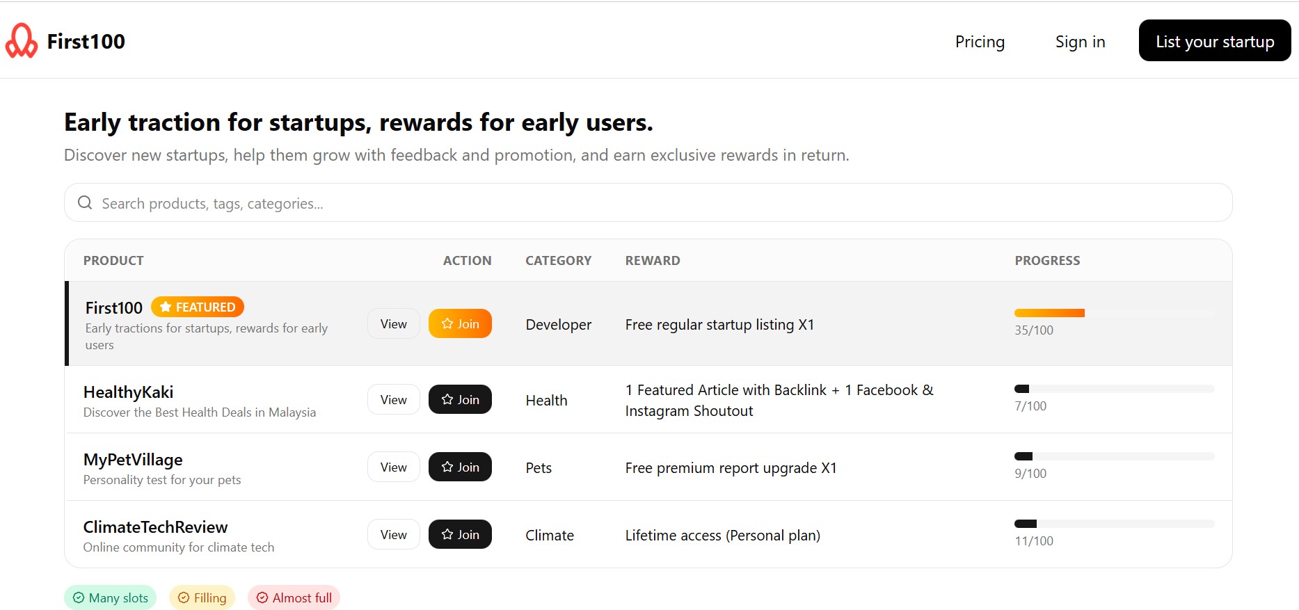 First100 was born from my own pain point: finding real early adopters for my products. It lets founders list their startups and connect with users who give genuine feedback and real promotion on X. For early users, it’s a way to discover new products first, and get rewarded with lifetime access, discounts, and exclusive perks.