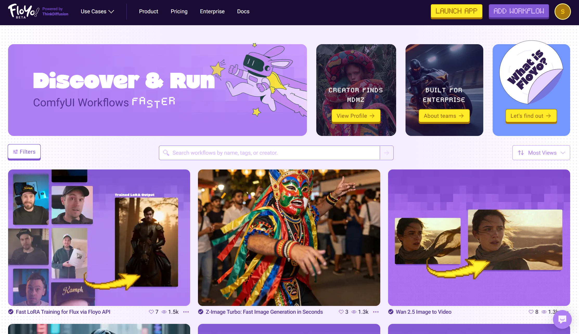Run every workflow you can imagine, keep it secure, and upskill your team, all in the same place. Floyo brings full ComfyUI to your browser, making it effortless to find & run open source workflows. 3-Second launch, Zero setup, free unlimited workflow building. Premade workflows ready to run, faster, easier sharing, all open source with no limits.