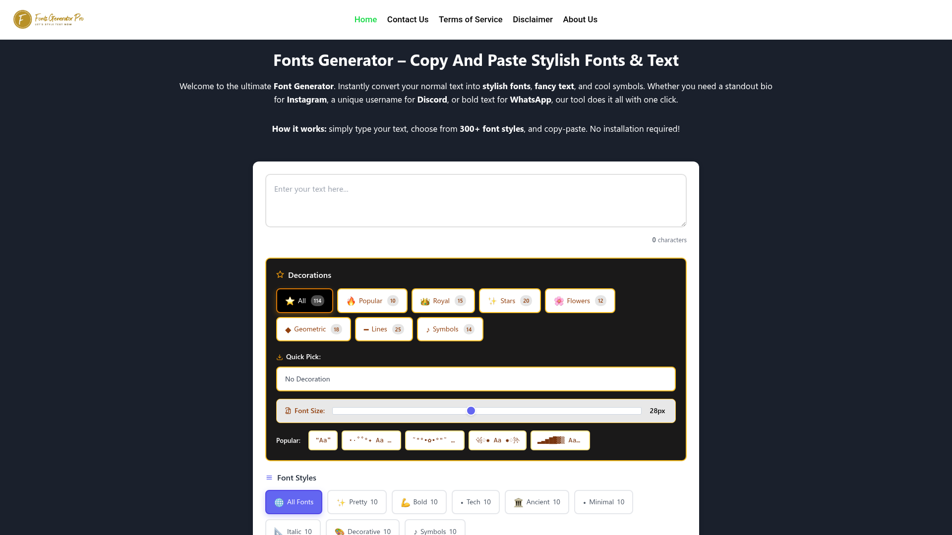 Fonts Generator Pro is entirely free to use. All 300+ font styles and features are accessible without any charges, premium upgrades, or registration, ensuring a completely open and accessible tool for everyone.