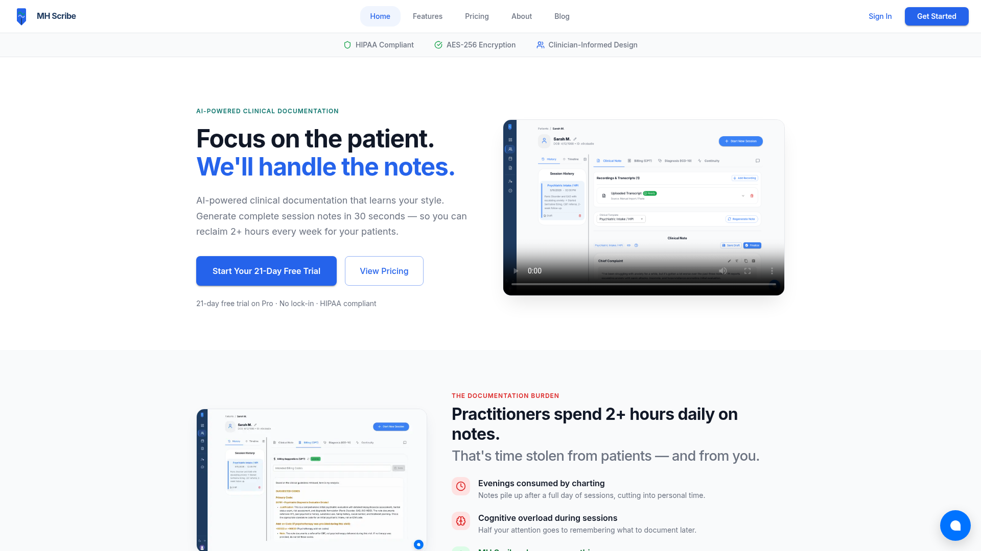 MH Scribe offers a powerful and secure solution for mental health professionals seeking to optimize their documentation process. By integrating advanced AI with a clinician-centric design, it empowers practitioners to deliver better patient care while reclaiming their valuable time. Explore MH Scribe's 21-day free trial to experience a transformative approach to clinical documentation.