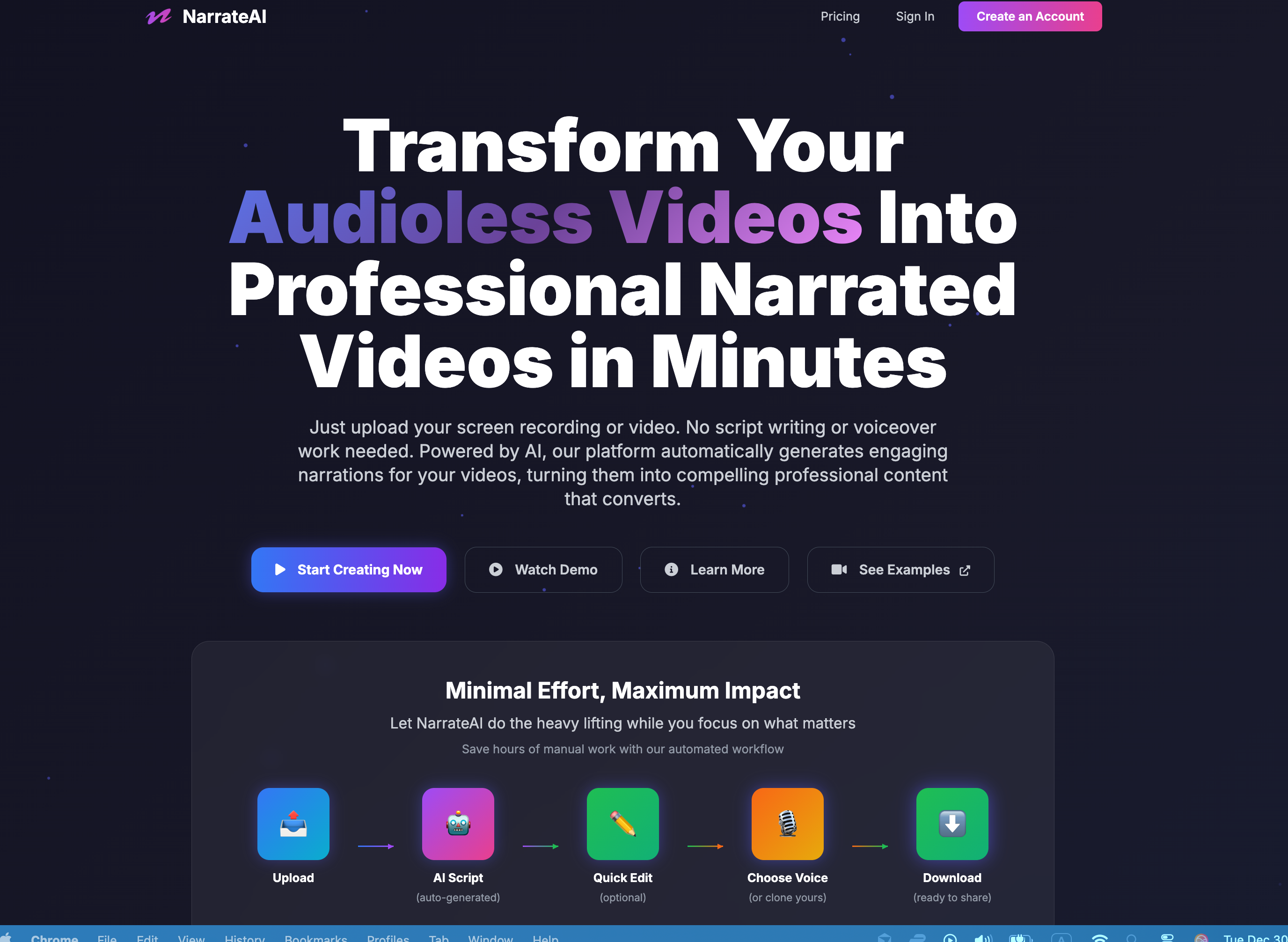 Transform silent screen recordings into professionally narrated videos in minutes using AI. Just upload and let NarrateAI do the talking.