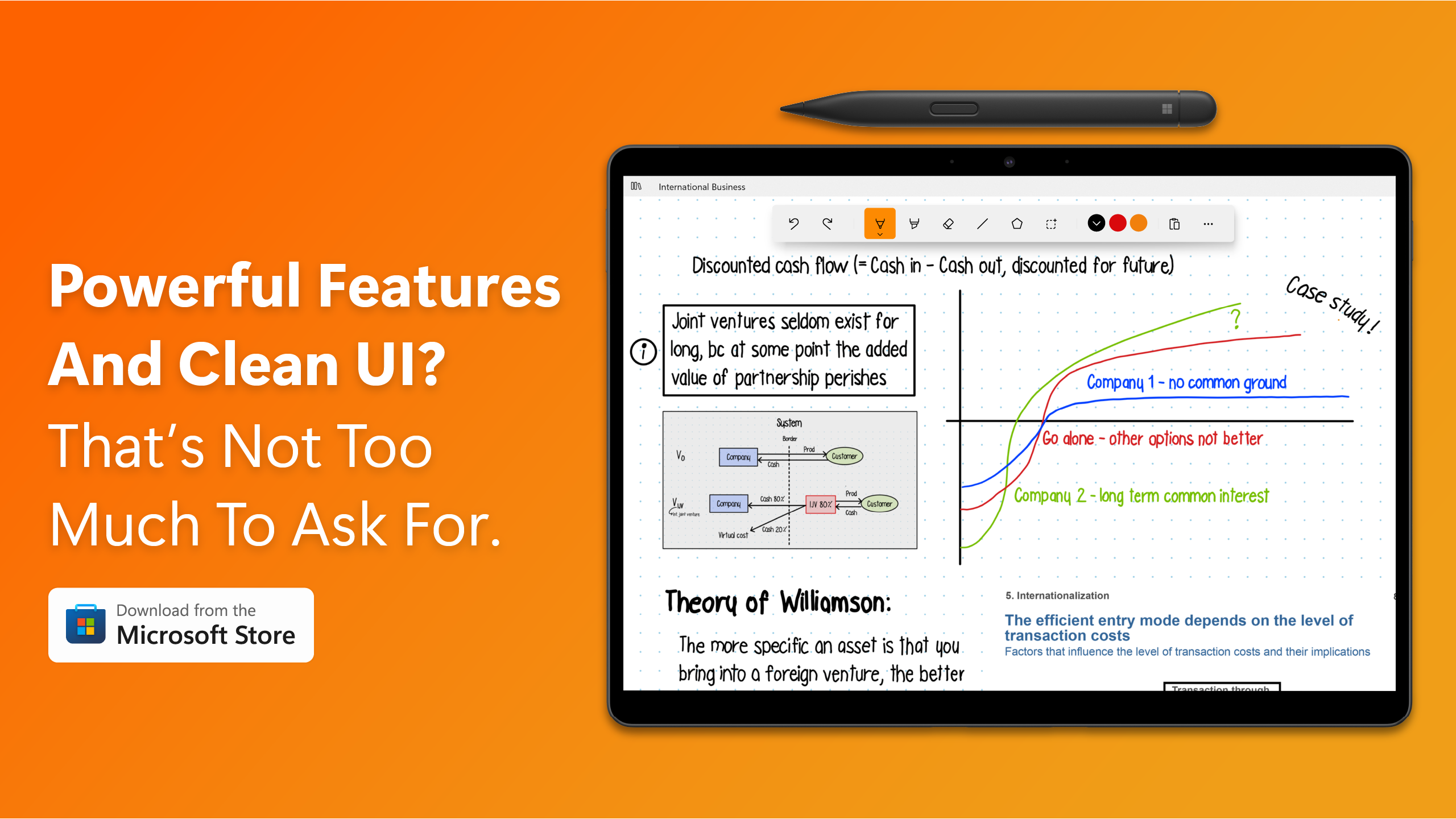 Noteastic is the best in class native Windows handwriting app. Enjoy smooth note-taking without any bloat. Clean interface, responsive pen input, seamless PDF annotation—everything you need to capture lecture notes, mark up documents, or sketch ideas. No lag, no clutter, just notes that flow naturally on your Windows device.