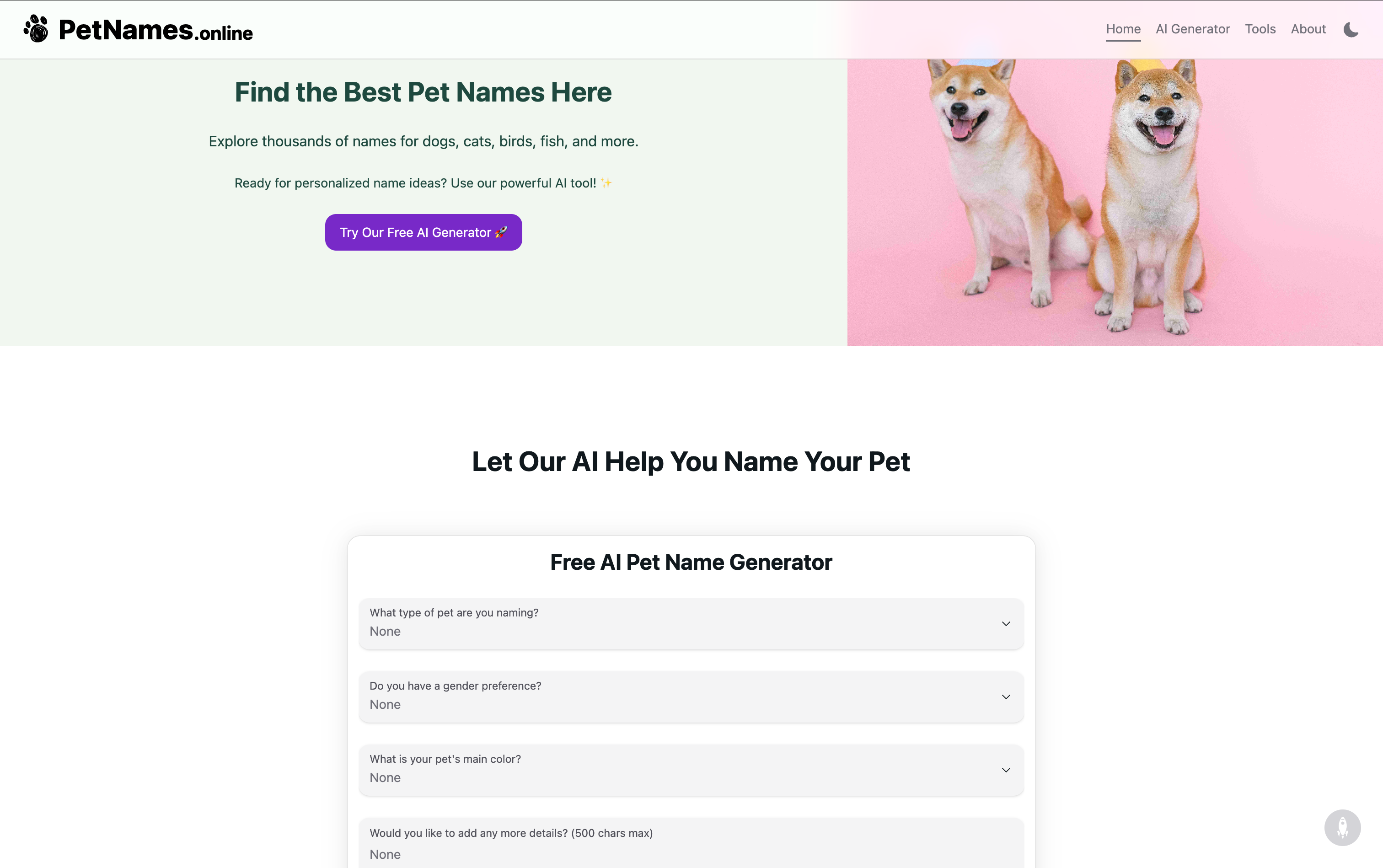 PetNames.online is a comprehensive, free online platform dedicated to pet naming. The website features a powerful AI-powered Pet Name Generator that helps pet owners discover the perfect names for their companions. With an extensive database covering dogs, cats, birds, fish, and numerous other animals (including niche pets like reptiles, insects, and farm animals), the platform offers personalized name suggestions filtered by personality traits, physical characteristics, and style preferences (cute, funny, unique). Users can browse trending pet names for 2025, explore names organized by pet type and naming style, and access specialized AI generators for over 20+ different animal categories. The site is completely free to use and serves as an all-in-one resource for pet naming inspiration across every imaginable pet type.