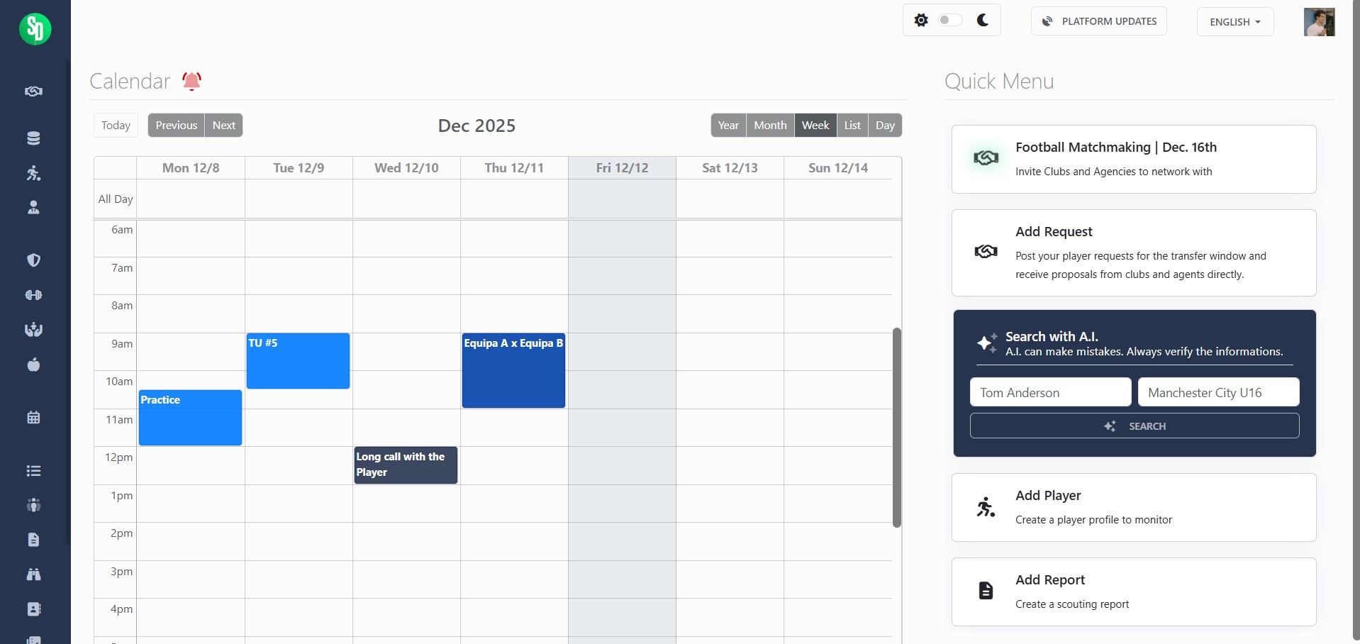 ScoutDecision is a software for football (soccer) and futsal Clubs, Agents, Scouts, and Coaches, while empowering them to connect with each other.