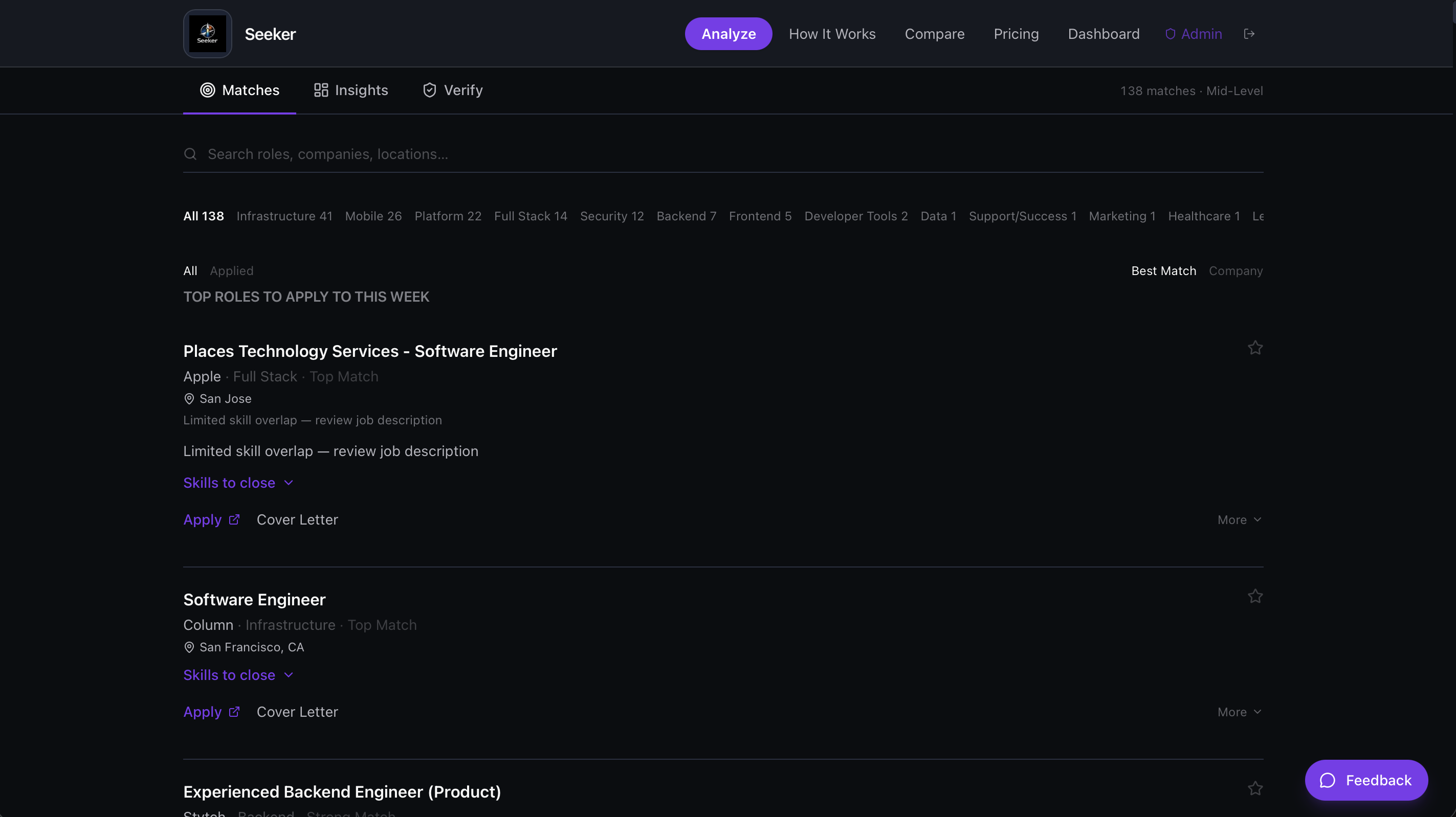 Seeker analyzes your resume and shows you where you actually stand in today’s job market. See your market rank, best-fit roles, and the exact skill gaps holding you back. Instead of guessing what to apply for, Seeker helps you focus on roles you can realistically land right now and how to move closer to your target. Discover “bridge roles” that act as stepping stones toward your goal, along with real job matches based on your current profile. Unlike generic resume tools, Seeker focuses on what you can do next, not just how you look on paper. No signup required to start. Private by default.