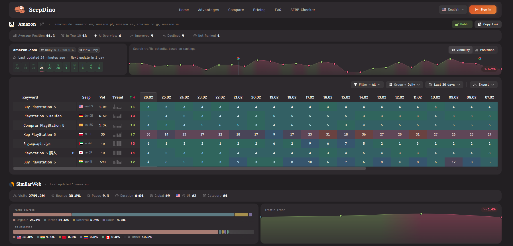 SerpDino is a low-cost Google rank checker built by a real SEO. Track your SERP positions with unlimited keywords and smart competitor auto-detection — without the enterprise price tag.