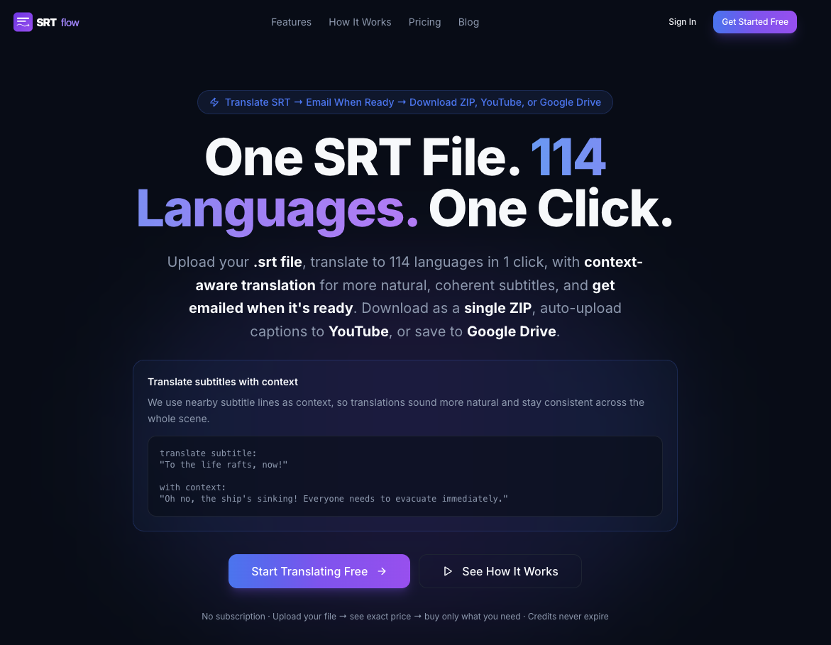 Translate any .srt subtitle file to 114 languages in 1 click. Context-aware AI keeps dialogue natural. Auto-upload captions to YouTube, save to Google Drive, or download as ZIP. Pay-as-you-go — no subscription.