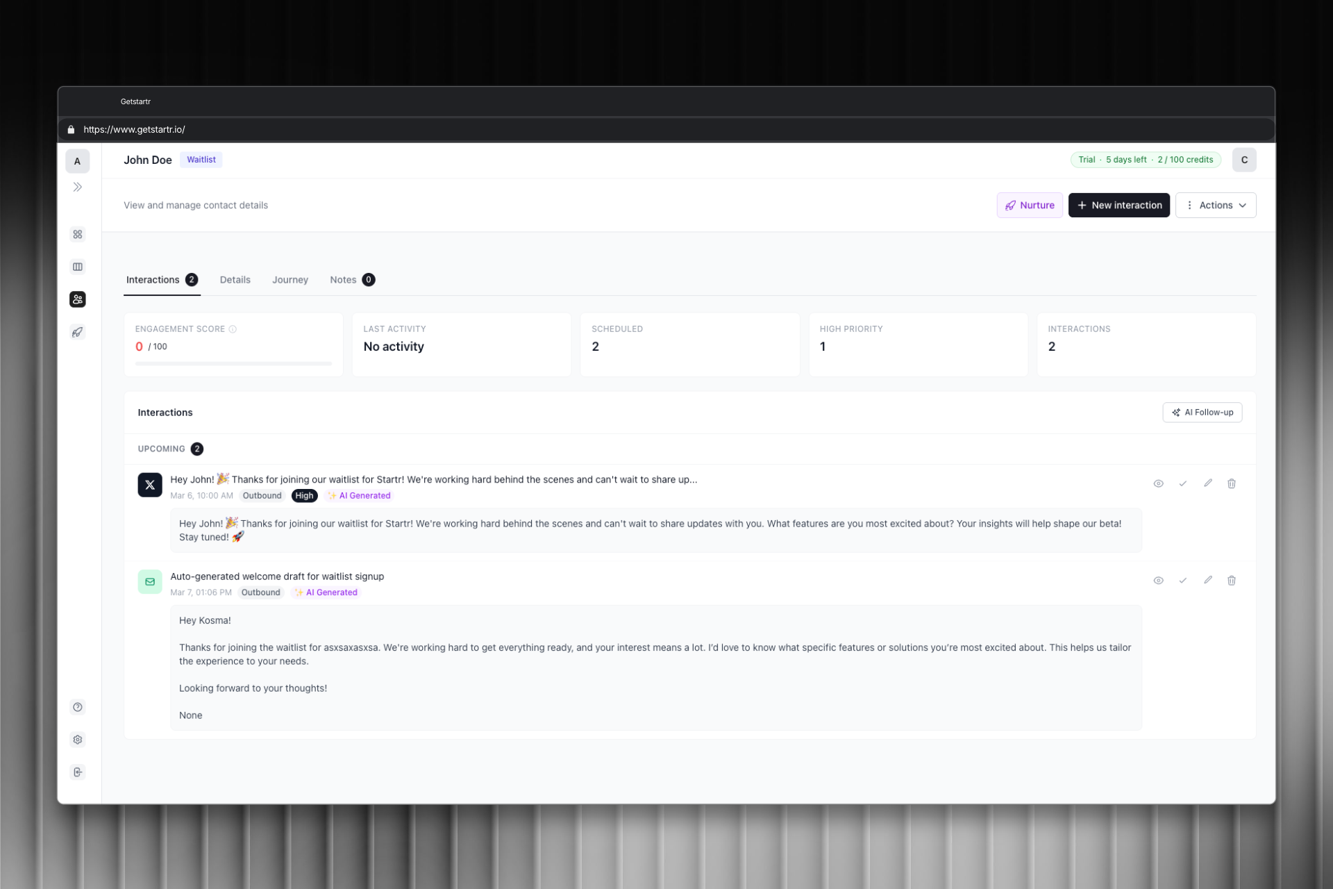 Includes features like interaction tracking, engagement scoring, AI follow-up suggestions, outreach scenarios, and built-in waitlist pages that automatically collect and organize new signups.