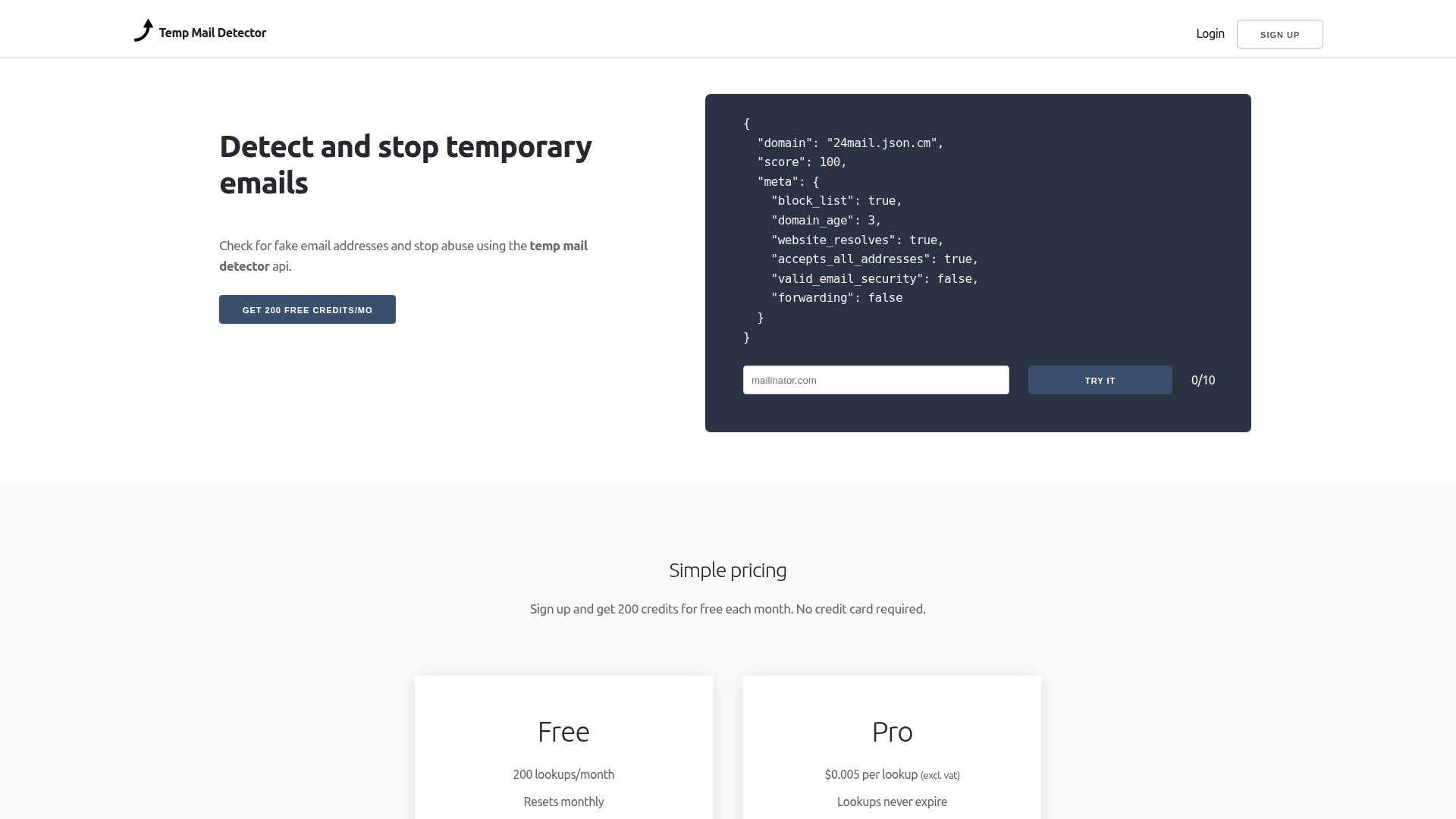 Temp Mail Detector offers a flexible Freemium model. A Free tier provides 200 lookups per month (resets monthly, no credit card required). The Pro plan costs $0.005 per lookup (excl. VAT), with lookups that never expire and a pay-as-you-go structure, also requiring no credit card to start.