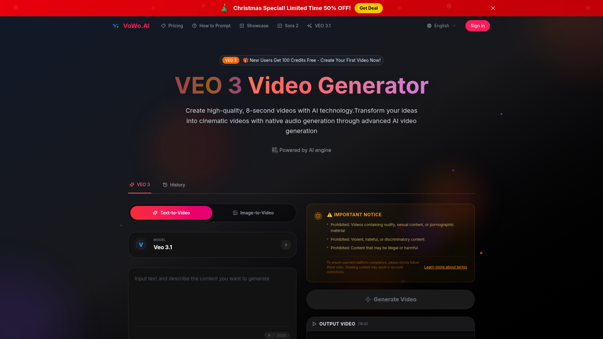 VoWo.AI presents VEO 3 Video Generator, an advanced AI-powered platform designed to create high-quality, 8-second cinematic videos with native audio generation. It targets content creators, marketers, and businesses looking to transform ideas into immersive visual stories effortlessly.